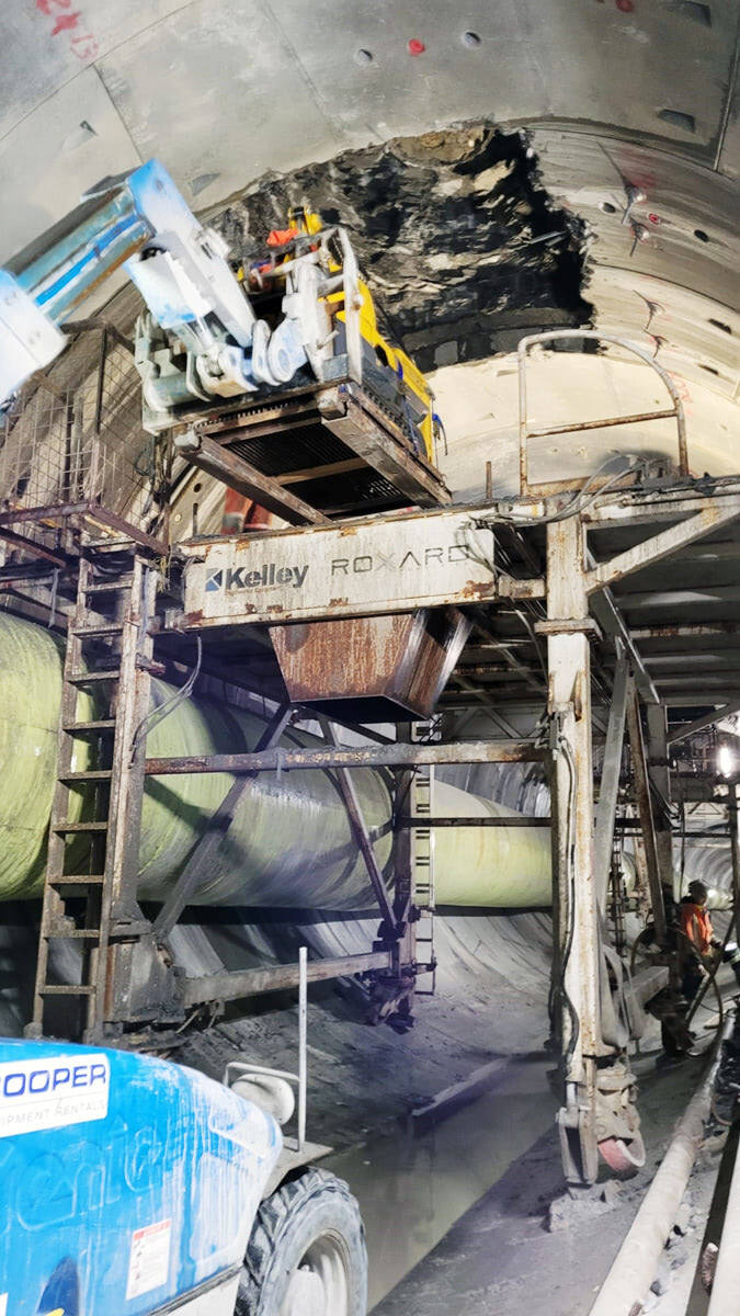 Connecting the risers to the tunneling system became the most intricate aspect of the project. The Southland Mole crew had to excavate upward through the new tunnel into the lakebed above to link the risers to the tunneling system. This necessitated forward thinking and careful consideration of equipment.